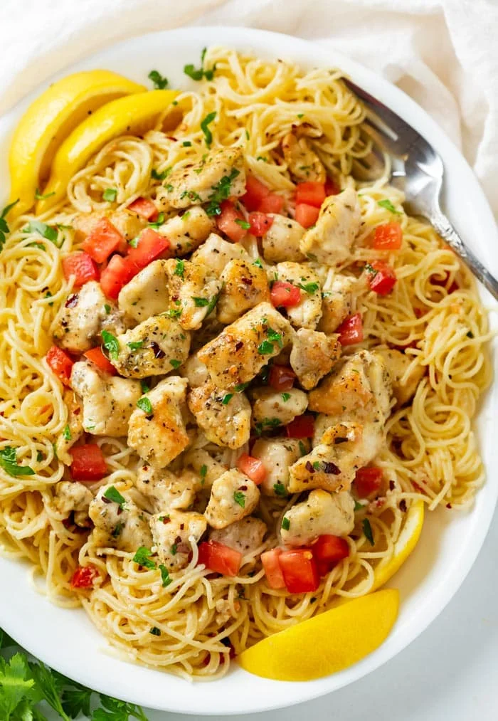 This easy recipe features tender chicken sautéed in a luscious garlic butter sauce, complemented by angel hair pasta, white wine, and fresh lemon juice.
