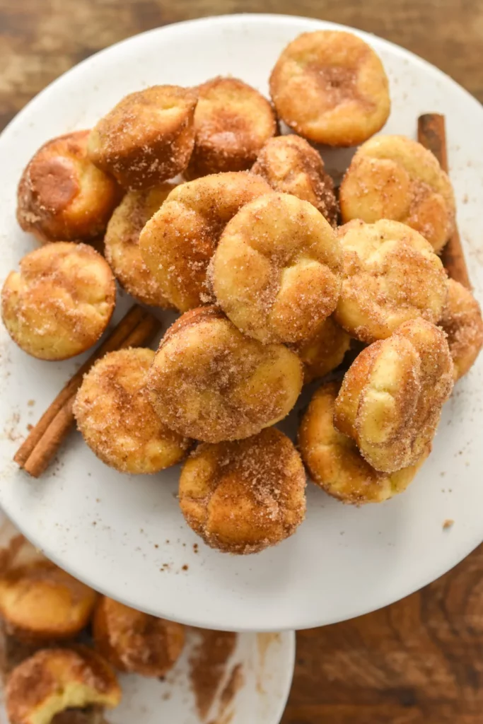 - Dunk each mini into the melted butter, then roll in the cinnamon-sugar mixture until evenly coated.